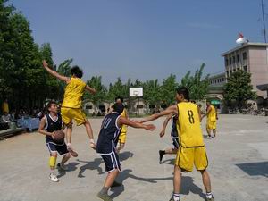 为丰富农场职工的节日文化生活,潘村湖农场于4月 28日至29日举办了第十六届职工篮球赛。全场有12 个单位单独或联合组织了9支球队参加比赛。正在农 场调研的集团公司副总经理李卓民兴致勃勃地为本 届比赛开球。经过2天共12场激烈比赛,最后一分场 获得冠军,粮油公司和建筑公司联队名列第二,二 分场获得第三名。图为精彩激烈的比赛瞬间。(杨 登宏摄)