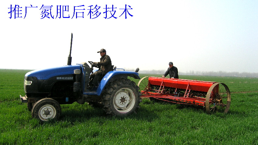 在六分场一块大田,职工陈普选正在追施氮肥。看到童俊等农技人员走近,陈普选停下机具问道:“现在播肥迟不迟?”童俊拔起一株麦苗看了看说道:“现在播施氮肥正当时,播早了并不好,适度的氮肥后移对小麦增产很重要。”