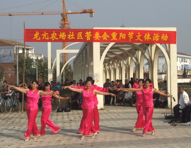 为隆重庆祝重阳节,在全场营造敬老爱老助老的良好社会风气,社区管委会举办了此次“九九”重阳节文艺演出。演出的节目包括舞蹈、歌曲、戏曲、太极剑等。青年演员用欢快的歌声和优美的舞姿,讴歌了农场敬老爱老助老的优秀传统美德;老年演员用铿锵不老的唱腔和高亢激昂的旋律塑造了他们“人老不失戎马志,余热生辉耀九重”的人生追求,表现了他们对晚年美好幸福生活的赞誉……演员们精彩的表演不时博得现场观众的热烈掌声。整场演出颂扬了龙亢农场老龄事业的蓬勃发展,体现了龙亢农场老年人老有所养、老有所乐、老有所为的精神风貌。