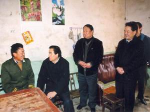春节前夕,省政府副省长赵树丛(左二)在农垦集团公 司党委书记丁俊先(右一)、宣郎广茶业总公司经理 孙国安(左三)陪同下,到省农垦宣郎广茶业总公 司陈先武家慰问。