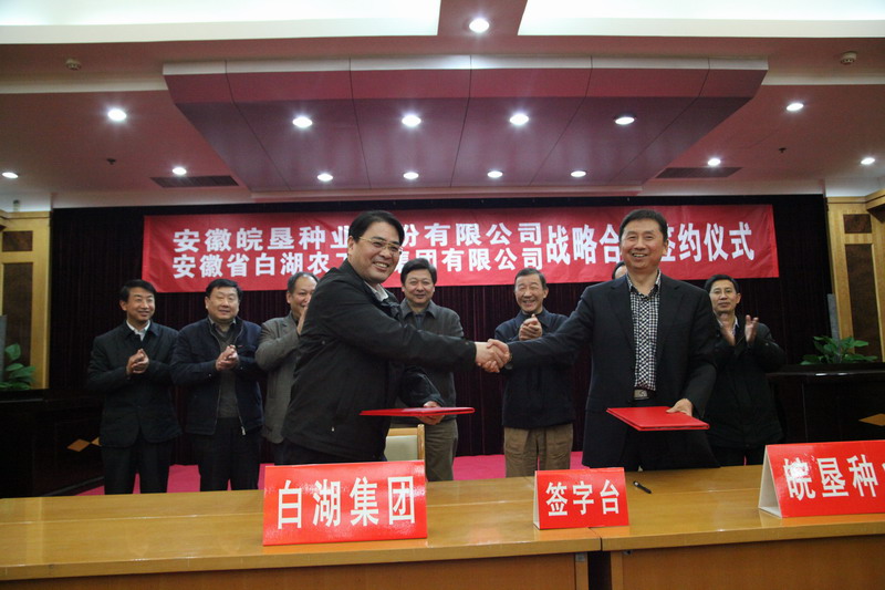 仪式上,皖垦种业总经理王占廷、白湖农工商董事长程志先分别代表各自在协议书上签字。双方表示,开展战略合作后,将架起合作的新桥梁,找到合作的最佳途径,不断开拓种业合作的深度和广度。 (马梓耀)