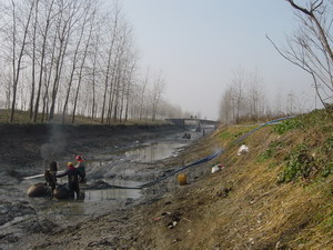日前,农场正抓住有利时机,因地制宜,紧锣密 鼓,扎实开展冬修水利工程建设。农场统一安排了 6台吸浆机加紧对大沟清於;刚刚结束秋收秋种任 务的农业单位职工积极响应农场号召,不等不靠, 纷纷投入到各自条田沟清於劳动当中,掀起了水利 冬修的热潮.(图为吸浆机清於作业现场) (夏庆 芳)